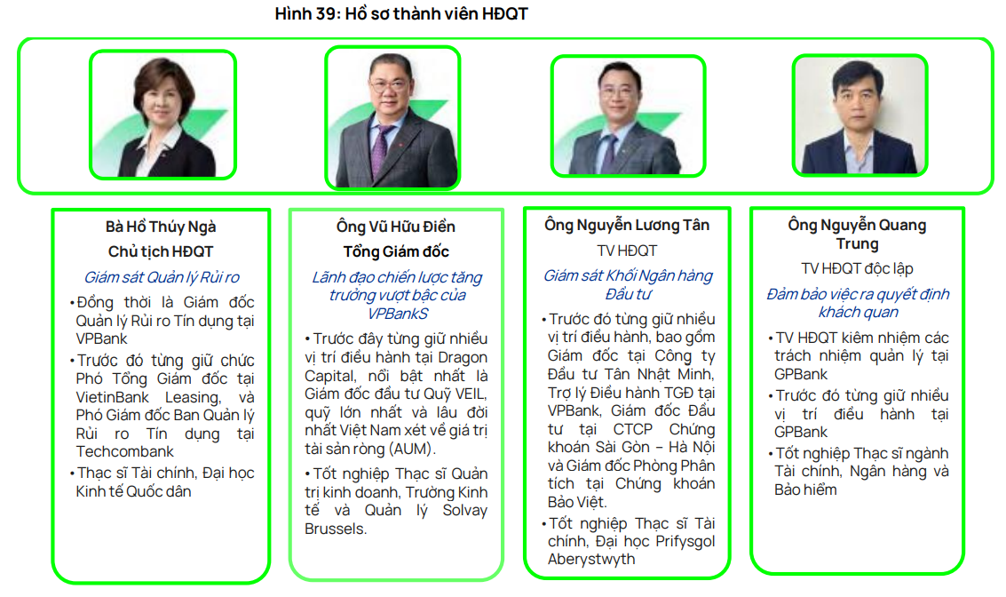 Đội ngũ ban lãnh đạo thể hiện sự kết hợp chặt chẽ giữa chuyên môn về tài chính, công nghệ và vận hành, được điều chỉnh để hỗ trợ quỹ đạo tăng trưởng chiến lược của công ty. Với đội ngũ lãnh đạo cấp cao giàu kinh nghiệm đến từ các công ty chứng khoán uy tín như bà Ly Ly (nguyên Giám đốc Nhân sự và COO tại SSI), ông Steve Yam (nguyên Giám đốc Công nghệ Thông tin tại SSI) và ông Tân (nguyên Giám đốc Đầu tư tại SHS), mỗi trụ cột kinh doanh của VPBankS đều được dẫn dắt bởi những chuyên gia đầu ngành, đảm bảo khả năng thực thi hiệu quả lộ trình phát triển đầy tham vọng của công ty.
