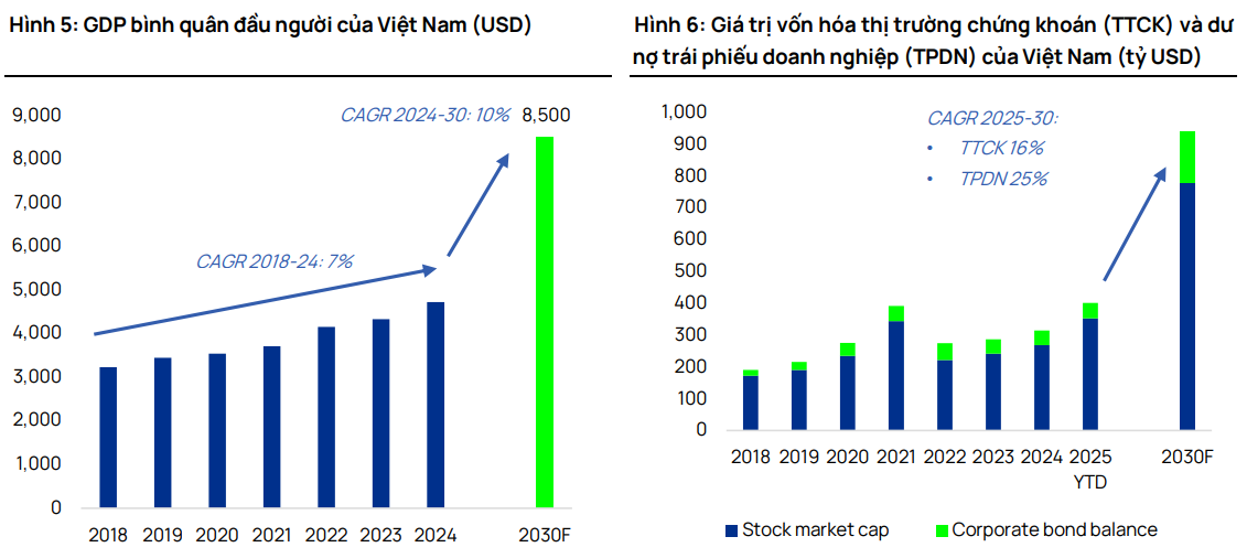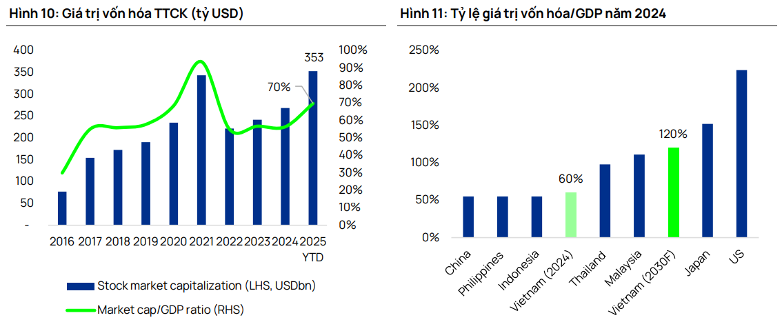 Thị trường vốn Việt Nam đang bước vào một giai đoạn bứt phá. Tăng trưởng GDP mạnh mẽ, các chính sách ủng hộ tăng trưởng và cải cách cơ cấu đang thúc đẩy một chu kỳ mở rộng bền vững. Với VN-Index trong một chu kỳ tăng giá dài hạn mới và hoạt động IPO đang được đẩy mạnh, việc nâng hạng lên Thị trường Mới nổi theo phân loại của FTSE Russell được dự kiến có thể thu hút 5-6 tỷ USD vốn nước ngoài (ước tính của chúng tôi). Tuy nhiên, tỷ lệ vốn hóa thị trường trên GDP của Việt Nam vẫn còn thấp hơn nhiều so với các nước cùng khu vực. Ngoài ra, dư địa tăng trưởng cho thị trường trái phiếu doanh nghiệp là rất lớn với mục tiêu của Chính phủ là đạt 25% GDP vào năm 2030 (so với 11% hiện tại). Khi đầu tư cơ sở hạ tầng định hình nền kinh tế và các cải cách quy định thúc đẩy nhu cầu huy động vốn của khu vực tư nhân, các công ty chứng khoán (CTCK) có vị thế tốt dễ hưởng lợi.