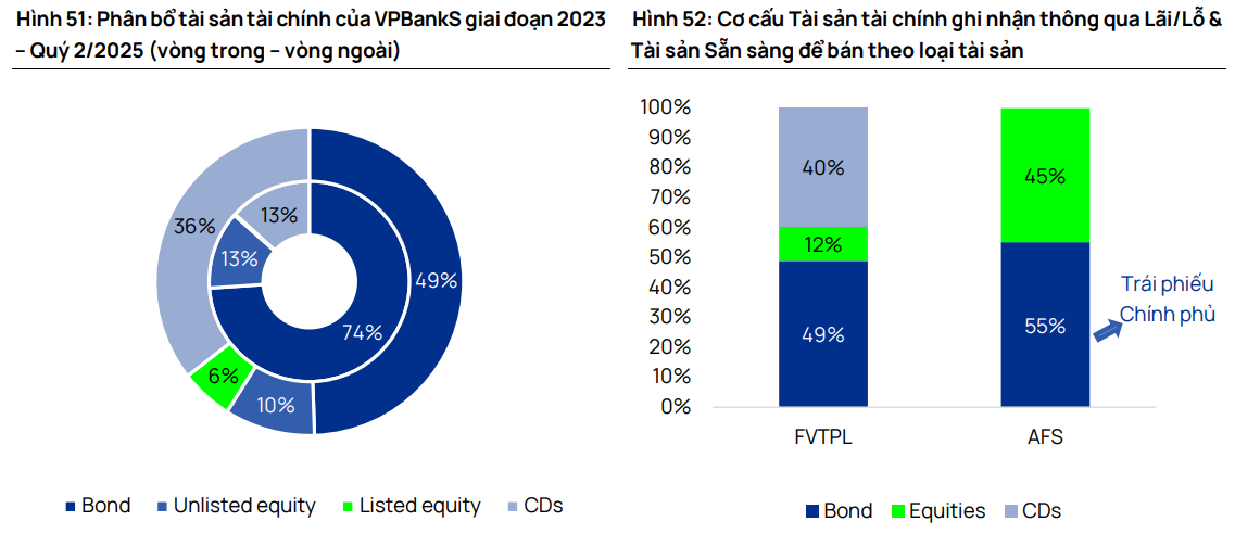 Tiềm năng lớn từ hoạt động đầu tư tự doanh, được thúc đẩy bởi hoạt động quản lý danh mục chủ động và mở rộng mảng IB. Trong 6T/2025, VPBankS đã ghi nhận tổng giá trị giao dịch trái phiếu đạt khoảng 76 nghìn tỷ đồng (+61% YoY). Bên cạnh đó, hoạt động giao dịch cổ phiếu cũng tăng mạnh, nhờ triển khai các khoản đầu tư ngắn hạn vào cổ phiếu niêm yết, qua đó đóng góp đáng kể vào mức tăng mạnh của Tài sản tài chính ghi nhận thông qua lãi/lỗ (FVPTL) trong cùng kỳ. Công ty kỳ vọng phân khúc trái phiếu doanh nghiệp sẽ tiếp tục là nguồn đóng góp lớn nhất cho lợi nhuận FVPTL. Đồng thời, chúng tôi nhận thấy rằng VPBankS đang theo đuổi chiến lược đa dạng hóa danh mục rõ nét hơn, với mục tiêu phân bổ vốn vào nhiều loại tài sản và lĩnh vực ngành nghề rộng hơn. Sự dịch chuyển chiến lược này được kỳ vọng sẽ hỗ trợ tăng trưởng lợi nhuận bền vững và ổn định hơn cho mảng đầu tư tự doanh trong các giai đoạn tới.
