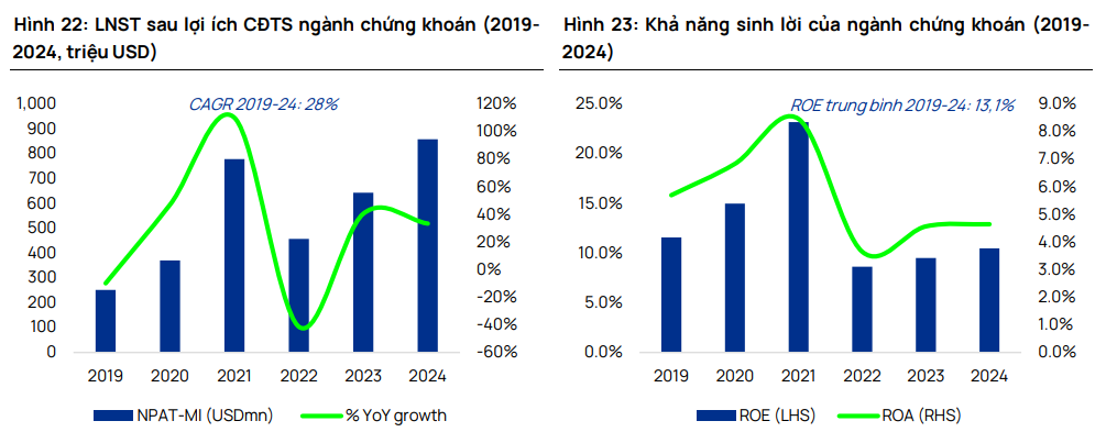Không chỉ ghi nhận tăng trưởng doanh thu mạnh mẽ và bảng cân đối kế toán mở rộng đáng kể trong những năm gần đây, các CTCK còn đạt được tăng trưởng lợi nhuận vượt trội qua các chu kỳ thị trường. Trong giai đoạn 2019–2024, 30 CTCK lớn nhất theo tổng tài sản đã đạt CAGR tổng lợi nhuận là 28% và tổng lợi nhuận của các CTCK đã đạt 860 triệu USD vào năm 2024. Tổng ROE của các CTCK đã đạt mức cao hơn 23% trong chu kỳ tăng giá vào năm 2021.