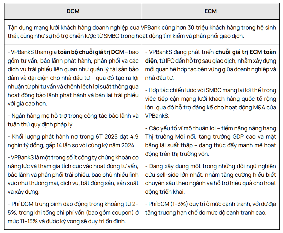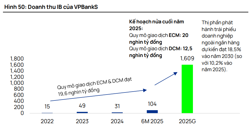 Chúng tôi đánh giá năm 2025 sẽ là một năm có mức cơ sở cao đối với doanh thu ngân hàng đầu tư, được hỗ trợ bởi doanh thu mảng thương vụ lớn trong cả ECM và DCM. Từ năm 2026, chúng tôi dự báo mức đóng góp doanh thu ngân hàng đầu tư sẽ trở lại mức bình thường, chủ yếu do triển vọng thận trọng hơn đối với các giao dịch ECM. Dù vậy, mức tăng trưởng liên tục của thị trường trái phiếu doanh nghiệp cùng với vị thế cạnh tranh vững chắc của VPBankS được kỳ vọng sẽ duy trì doanh thu ngân hàng đầu tư ở mức tích cực trong dài hạn.