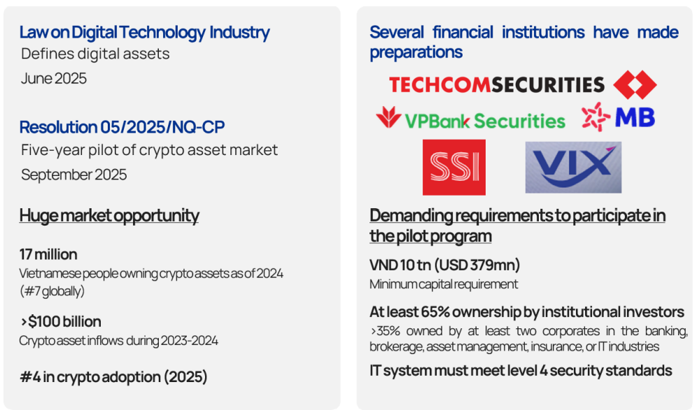 Tài sản số được xem là một cơ hội kinh doanh tiềm năng đáng kể cho ngành chứng khoán trong trung-dài hạn. Trong các tháng gần đây, Chính phủ đã ban hành Luật Công nghiệp Công nghệ số và Nghị quyết 05/2025/NQ-CP, đặt nền móng pháp lý cho việc hình thành và vận hành thị trường tài sản số tại Việt Nam. Một số CTCK như TCBS, SSI, và VIX đã có sự chuẩn bị, trong khi các công ty được hậu thuẫn bởi các ngân hàng lớn như MBS, VPBankS và HDBS cũng cho thấy tiềm năng thành lập nhằm tận dụng điều kiện để triển khai dịch vụ giao dịch tài sản số. Tuy nhiên, thị trường chưa thể vận hành chính thức cho đến khi: