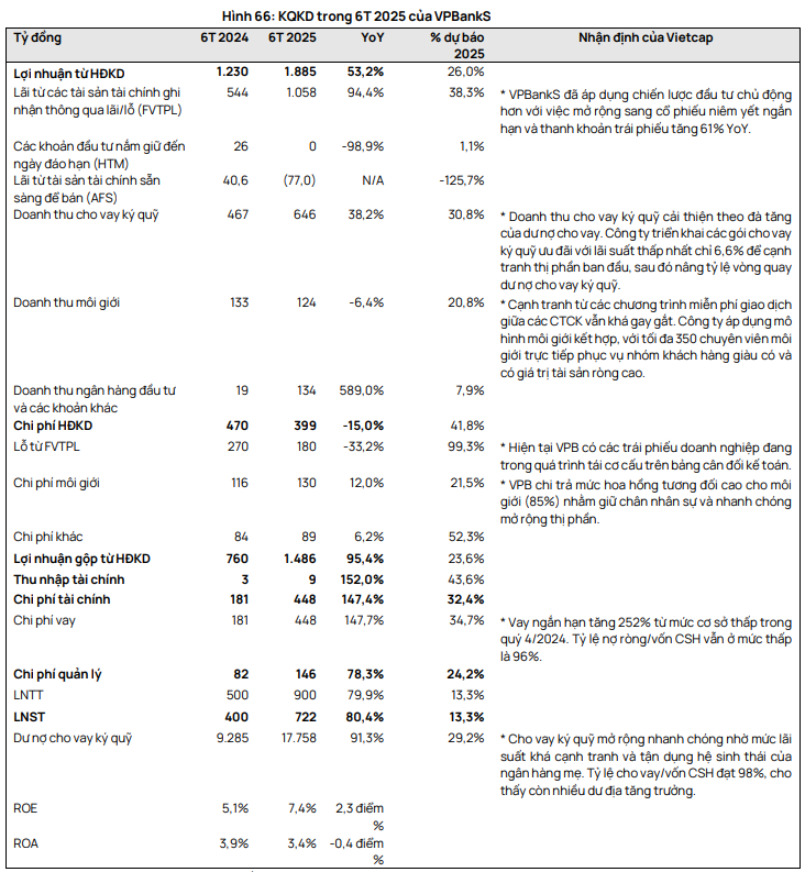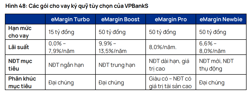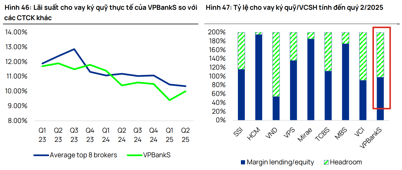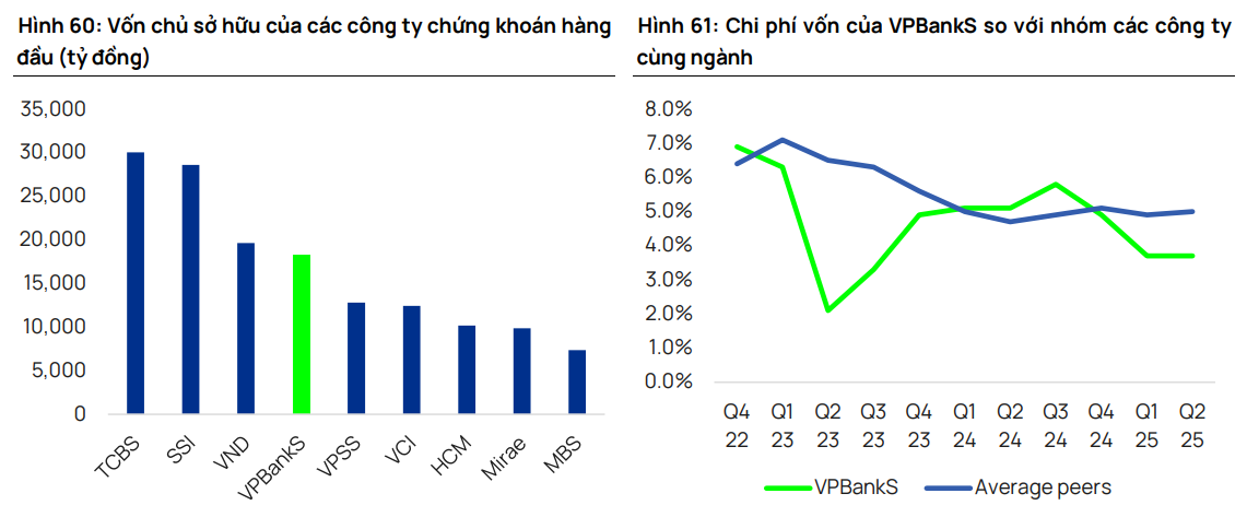 Mở rộng mạnh mẽ mảng cho vay ký quỹ nhờ chi phí vốn cạnh tranh và nền tảng vốn vững chắc. Chỉ sau 3 năm đi vào hoạt động, VPBankS đã tăng trưởng ấn tượng dư nợ cho vay ký quỹ lên 17,8 nghìn tỷ đồng (xếp vị trí thứ tư) tính đến quý 2/2025, trong đó phần lớn đến từ phân khúc khách hàng cá nhân. Đến cuối quý 3/2025, dư nợ cho vay ký quỹ của VPBankS đã tăng lên khoảng 27-28 nghìn tỷ đồng (xếp vị trí thứ ba). Bên cạnh các điều kiện vĩ mô được cải thiện trong 2 năm qua, chúng tôi cho rằng sự tăng trưởng này là nhờ vào (1) công ty đã thu hút khách hàng thành công, (2) nền tảng vốn vững mạnh của VPBankS tạo ra dư địa cho vay ký quỹ lớn, và quan trọng nhất là (3) mức lãi suất cho vay ký quỹ cạnh tranh được điều chỉnh phù hợp với nhiều phân khúc khách hàng nhờ lợi thế chi phí vốn thấp.