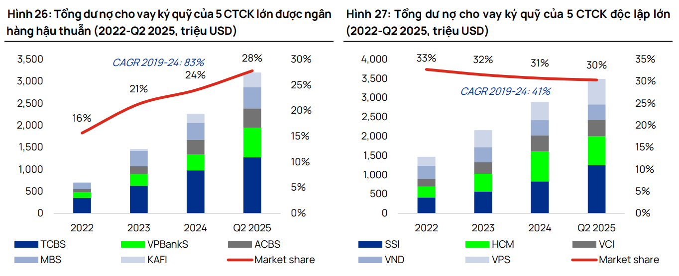 Trong bối cảnh nhu cầu cho vay ký quỹ đang tăng mạnh, xu hướng chính của ngành mà chúng tôi đã chứng kiến trong những năm gần đây là các công ty chứng khoán được hậu thuẫn bởi ngân hàng đã giành được thị phần đáng kể từ các công ty chứng khoán độc lập. Để minh họa, tổng dư nợ cho vay ký quỹ của năm công ty chứng khoán lớn được hậu thuẫn bởi ngân hàng, bao gồm TCBS, VPBAnks, ACBS, MBS và KAFI, đã tăng với tốc độ vượt dự kiến từ chỉ hơn 700 triệu USD vào năm 2022 lên 3,2 tỷ USD vào cuối quý 2/2025, tương ứng với CAGR là 83%. Tổng thị phần cho vay của nhóm CTCK này đã tăng từ 16% vào năm 2022 lên 28% vào cuối quý 2/2025.