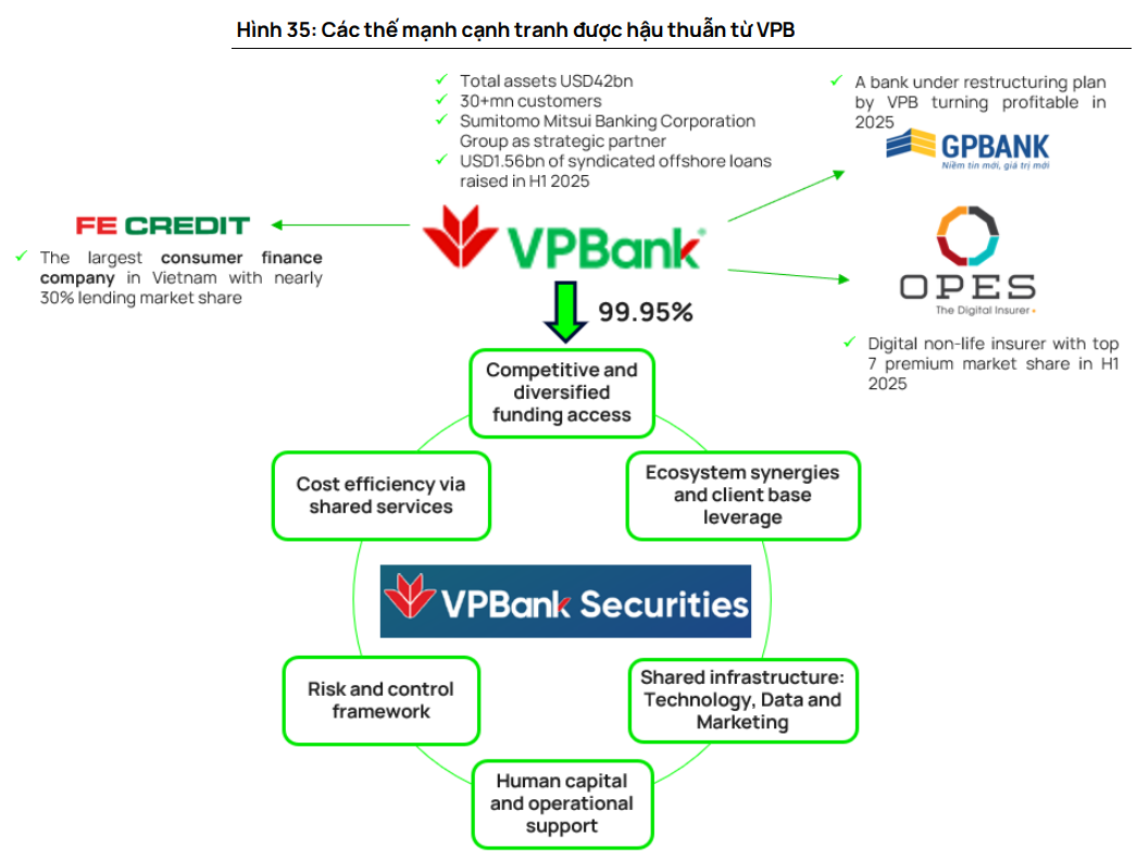 VPBankS có vị thế tốt để tận dụng sự hỗ trợ mạnh mẽ từ ngân hàng mẹ và đóng vai trò ngày càng mang tính chiến lược trong hệ sinh thái tài chính của VPB. Được hỗ trợ bởi nền tảng vốn vững mạnh của VPB và sự hiện diện của một đối tác chiến lược dài hạn, tập đoàn đã đưa ra một chiến lược tăng trưởng đầy tham vọng, bao gồm các khoản đầu tư đáng kể vào các công ty con để mở rộng danh mục sản phẩm và củng cố sức mạnh tổng hợp nội bộ. Theo định hướng chiến lược này, dựa trên kế hoạch kinh doanh của công ty và các dự phóng hiện tại của chúng tôi cho VPB, chúng tôi ước tính lợi nhuận của VPBankS tương đương khoảng 22%–27% LNTT hợp nhất của VPB trong giai đoạn 2025–2030, nhấn mạnh tầm quan trọng ngày càng tăng của công ty trong cơ cấu lợi nhuận của tập đoàn. Với sự hỗ trợ vận hành mạnh mẽ và khả năng tiếp cận các nguồn lực chung của tập đoàn, VPBankS được kỳ vọng sẽ tối ưu hóa hơn nữa hoạt động của công ty và đẩy nhanh tốc độ phát triển kinh doanh. Trong trung hạn, sự hậu thuẫn bền vững từ ngân hàng mẹ có khả năng vẫn sẽ là một lợi thế cạnh tranh then chốt, giúp VPBankS vượt trội so với các đối thủ trong bối cảnh dịch vụ tài chính đang phát triển nhanh chóng.