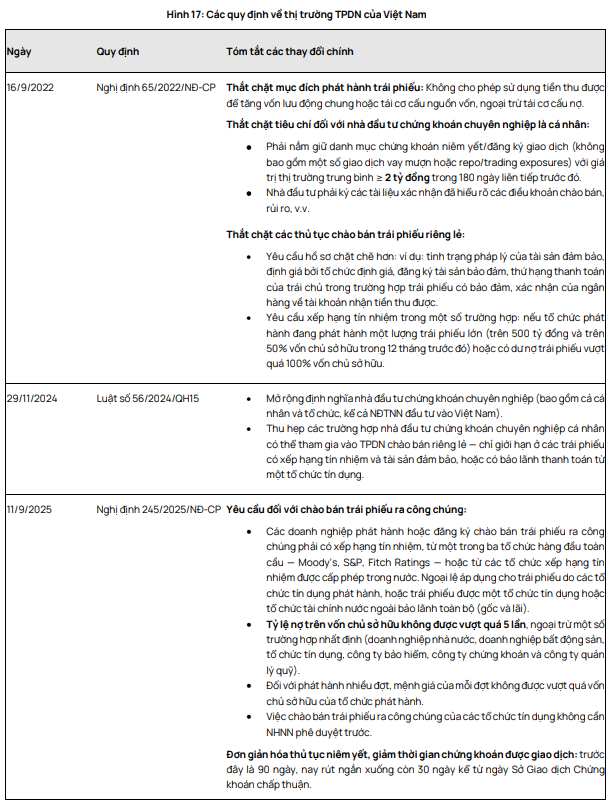 Kể từ đợt chấn chỉnh thị trường TPDN vào năm 2022, Chính phủ đã ban hành một loạt các quy định mới nhằm hướng thị trường này tới sự phát triển bền vững và dài hạn. Khuôn khổ pháp lý đã dần thắt chặt các mục đích phát hành, điều kiện nhà đầu tư và quy trình chào bán theo Nghị định 65/2022/NĐ-CP; mở rộng và làm rõ các quy định bảo vệ nhà đầu tư và quyền giám sát thông qua Luật số 56/2024/QH15; và gần đây nhất là tăng cường các yêu cầu đối với việc chào bán ra công chúng và niêm yết trái phiếu trong Nghị định 245/2025/NĐ-CP. Nhìn chung, những biện pháp này không chỉ nâng cao tính minh bạch và trách nhiệm giải trình mà còn đưa các hoạt động của thị trường trái phiếu Việt Nam tiệm cận hơn với các tiêu chuẩn quốc tế, nhằm mục đích khôi phục niềm tin của nhà đầu tư đồng thời đảm bảo việc huy động vốn ổn định cho các doanh nghiệp. Về phía trước, nền tảng pháp lý này cung cấp cơ sở để thị trường TPDN Việt Nam phát triển với sức mạnh và tính bền vững cao hơn.