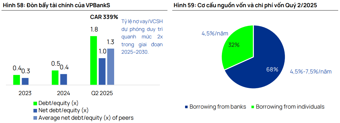 VPBankS đã thành công trong việc đa dạng hóa các nguồn vốn chi phí thấp. Tính đến Quý 2/2025, nợ phải trả của công ty chủ yếu đến từ các khoản vay ngắn hạn từ ngân hàng thương mại và khách hàng cá nhân – trong đó nhóm khách hàng cá nhân được huy động thông qua các sản phẩm thị trường tiền tệ phối hợp cùng ngân hàng mẹ. Ngoài ra, trong 6T 2025, VPBankS đã huy động được 150 triệu USD khoản vay hợp vốn quốc tế, và dự kiến huy động thêm 250 triệu USD trong 6T 2025 còn lại từ liên minh do SMBC dẫn dắt. Đáng chú ý, công ty hiện vẫn chưa khai thác kênh nợ dài hạn hay trái phiếu doanh nghiệp ngắn hạn, qua đó cho thấy dư địa lớn để tiếp cận thêm nguồn vốn trong tương lai. Chúng tôi cho rằng vị thế huy động vốn vững chắc này sẽ tạo nên tảng quan trọng để hỗ trợ các mục tiêu tăng trưởng tham vọng của VPBankS.