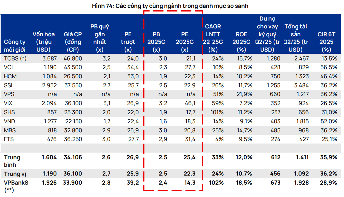 VPBankS mang lại tiềm năng tăng giá hấp dẫn, được hỗ trợ bởi triển vọng tăng trưởng mạnh mẽ, lợi thế dẫn đầu từ ngân hàng, cùng tiềm năng mở rộng sang quản lý tài sản và các lĩnh vực mới như tiền mã hóa và hàng hóa. Dựa trên kế hoạch kinh doanh của công ty, giá IPO tương ứng với P/B trước phát hành năm 2025 là lần ( lần sau phát hành) và P/E trước phát hành năm là lần, so với trung vị P/B dự phóng năm là lần và P/E dự phóng năm là lần của nhóm công ty cùng ngành tính đến ngày .