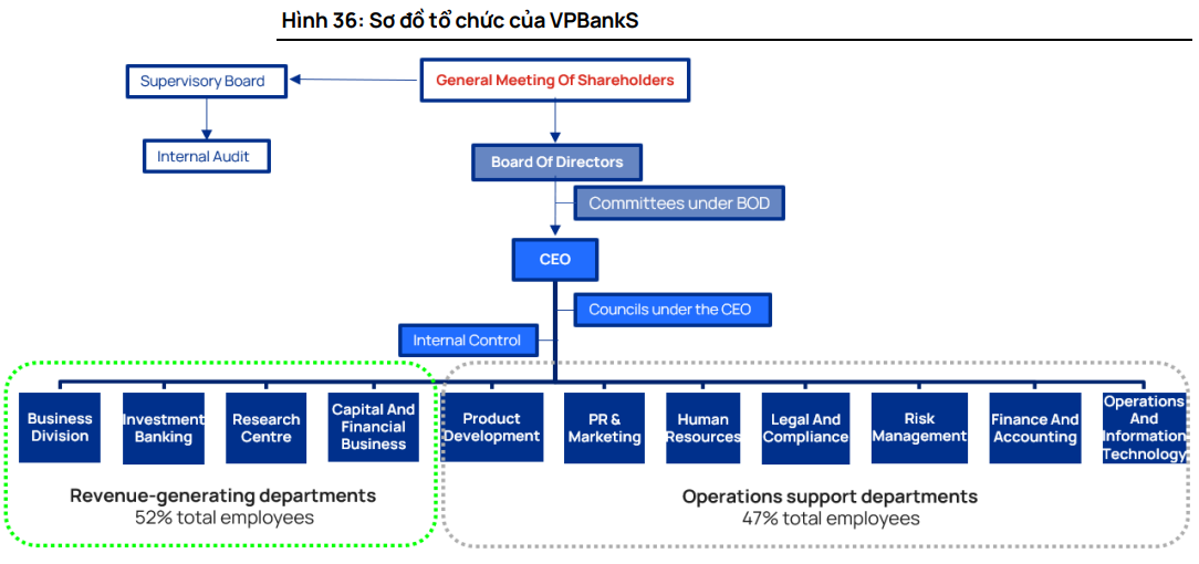 VPBankS áp dụng cơ cấu báo cáo tinh gọn và đơn giản. Công ty hoạt động dưới sự điều hành của một HĐQT độc lập, tách biệt với ngân hàng mẹ, trong khi vẫn hưởng lợi từ sự liên kết chiến lược chặt chẽ với ban lãnh đạo cấp cao của VPBank.