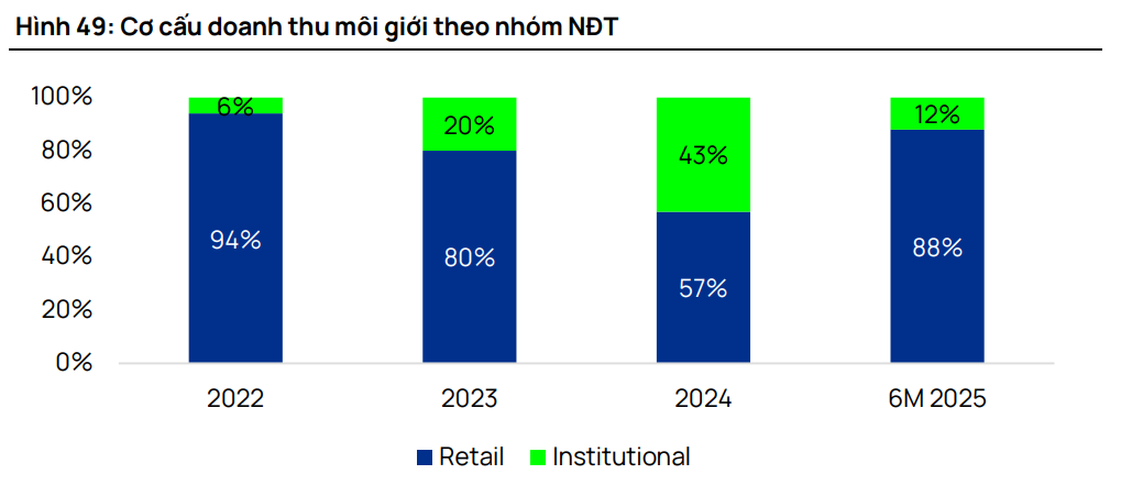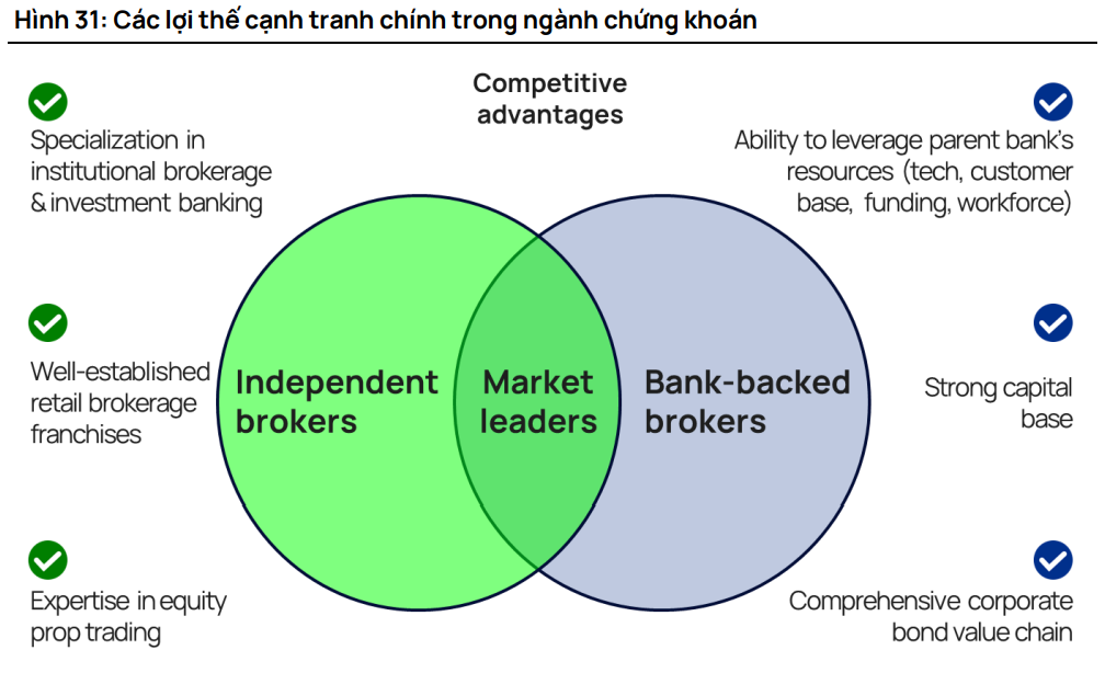 Trong chu kỳ trước, các CTCK có đội ngũ môi giới là con người lớn và các chính sách phí hoa hồng hấp dẫn đã có thể mở rộng thị phần. Tuy nhiên, trong chu kỳ hiện tại, chúng tôi tin rằng những công ty có khả năng tận dụng công cụ AI sẽ giành được lợi thế. Bằng cách cung cấp thông tin kịp thời, cá nhân hóa và dễ tiếp cận, các CTCK được hỗ trợ bởi AI có thể tăng cường sự gắn kết của khách hàng và mở rộng thị phần hiệu quả hơn, với chi phí thấp hơn đáng kể. Với bối cảnh cạnh tranh ngày càng gay gắt, chúng tôi kỳ vọng các công ty môi giới sẽ đẩy nhanh hơn nữa việc đầu tư vào các giải pháp AI, đặc biệt là những công ty có nền tảng vốn vững chắc và được hậu thuẫn từ ngân hàng mẹ.