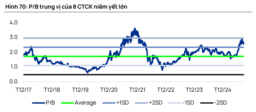 8 CTCK trên hiện đang giao dịch với P/B trung bình ở mức 2,5x, cao hơn khoảng 1,5 độ lệch chuẩn so với mức trung bình lịch sử từ năm 2018 là 1,7x, nhưng vẫn thấp hơn mức đỉnh là 3,6x, được ghi nhận trong năm 2021. Chúng tôi cho rằng định giá cao hơn của nhóm cổ phiếu chứng khoán trong năm nay phản ánh quan điểm lạc quan của nhà đầu tư về triển vọng lợi nhuận tích cực của ngành, được thúc đẩy bởi nhiều yếu tố thuận lợi như đã đề cập ở các phần trước. Dù toàn bộ các CTCK đều được hưởng lợi từ các yếu tố này, chúng tôi tin rằng sẽ có một số xu hướng ngành quan trọng quyết định đâu là các công ty dẫn đầu trong chu kỳ tăng trưởng hiện tại, như đã phân tích phía trên.