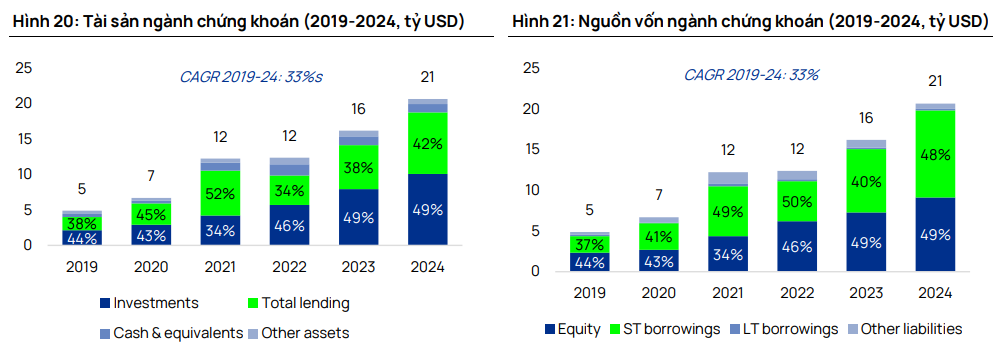 Bảng cân đối kế toán của các CTCK đã mở rộng đáng kể trong những năm gần đây khi ngành môi giới trở thành một trung gian tài chính quan trọng cho nền kinh tế bên cạnh ngành ngân hàng. Tổng tài sản của 30 CTCK lớn nhất tại Việt Nam đã tăng hơn gấp 3 lần trong giai đoạn 2019–2024, đạt 21 tỷ USD vào năm 2024 (CAGR 33%). Đầu tư và cho vay chiếm phần lớn tài sản của ngành, lần lượt là 49% và 42% (dữ liệu năm 2024). Về nguồn vốn, gần 50% nguồn vốn của ngành chứng khoán đến từ vốn chủ sở hữu của cổ đông. Phần còn lại chủ yếu đến từ các khoản vay ngắn hạn (48% tổng nguồn vốn) từ các ngân hàng thương mại, được sử dụng để tài trợ cho các hoạt động cho vay ký quỹ.