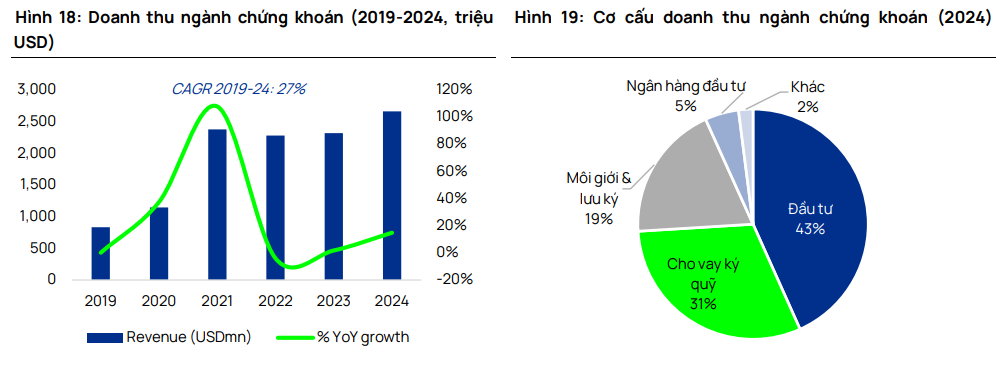 Ngoài ra, môi trường chính sách tiền tệ nới lỏng, kết hợp với kỳ vọng Fed cắt giảm dần lãi suất trong trung hạn, sẽ làm giảm áp lực tỷ giá và nâng cao sức hấp dẫn của Việt Nam như một điểm đến đầu tư. Tất cả các yếu tố này hợp lực tạo nên triển vọng tăng trưởng vững chắc cho thị trường vốn Việt Nam, qua đó mở ra dư địa phát triển mạnh mẽ cho mảng ngân hàng đầu tư.