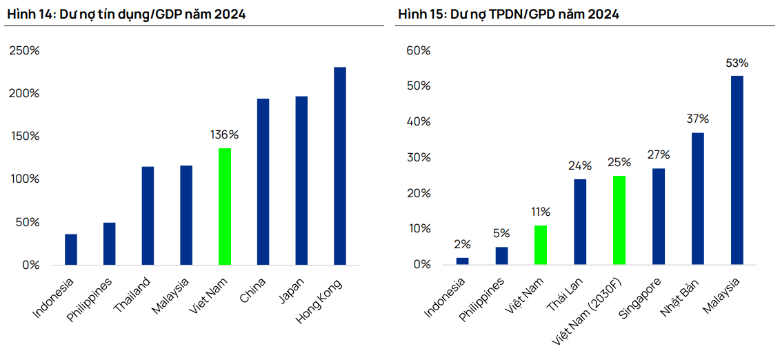Dữ liệu về nợ tư nhân trên GDP năm 2024 cho thấy mức 136% của Việt Nam cao hơn các nước cùng khu vực Đông Nam Á, chỉ thấp hơn các thị trường phát triển như Trung Quốc, Nhật Bản và Hồng Kông. Tuy nhiên, tỷ lệ dư nợ TPDN trên GDP của Việt Nam chỉ ở mức 11% vào năm 2024, thấp hơn nhiều so với các nước trong khu vực như Malaysia (53%), Singapore (27%) và Thái Lan (24%). Khoảng cách đáng kể này cho thấy tiềm năng lớn để thị trường TPDN của Việt Nam mở rộng. Hơn nữa, phần lớn nguồn vốn huy động từ ngân hàng vẫn là ngắn hạn và các ngân hàng bị giới hạn bởi quy định về tỷ lệ vốn ngắn hạn cho vay trung và dài hạn phải duy trì dưới 30% tổng vốn. Những hạn chế này giới hạn khả năng của các ngân hàng trong việc tài trợ cho các dự án dài hạn của doanh nghiệp, do đó khuyến khích việc phụ thuộc nhiều hơn vào phát hành trái phiếu để đáp ứng nhu cầu vốn trung hạn. Đến năm 2030, Chính phủ đặt mục tiêu thị trường TPDN sẽ mở rộng lên 25% GDP.