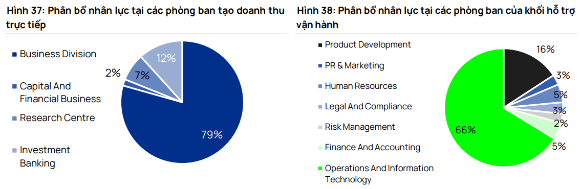 Cơ cấu lực lượng lao động của công ty phù hợp chặt chẽ với chiến lược tăng trưởng tập trung vào công nghệ, tạo sự cân bằng giữa việc mở rộng kinh doanh và hiệu quả vận hành. Với 52% nhân sự ở các vị trí tạo doanh thu, công ty duy trì sự tập trung mạnh mẽ vào phát triển kinh doanh cốt lõi. Trong khi đó, 47% nhân sự thuộc các chức năng vận hành và hỗ trợ, trong đó 66% trong đó là nhân sự CNTT và 16% dành riêng cho phát triển sản phẩm. Sự phân bổ này phản ánh rõ ràng chiến lược của công ty nhằm tận dụng AI, blockchain và phát triển nền tảng quản lý tài sản WealthTech để nâng cao các dịch vụ giao dịch, cho vay ký quỹ và quản lý danh mục đầu tư, đồng thời có kế hoạch mở rộng lĩnh vực tài sản số.