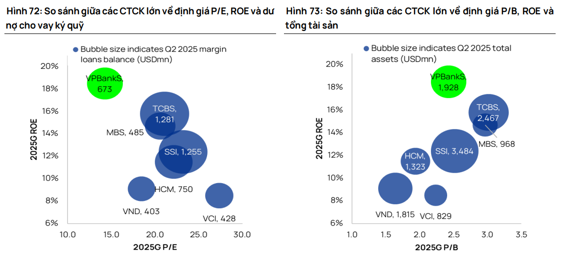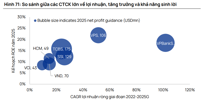 Dựa trên so sánh giữa các CTCK lớn theo các chỉ tiêu năm 2025, VPBankS và TCBS nổi bật về quy mô và khả năng sinh lời. Hai công ty này được kỳ vọng sẽ ghi nhận lợi nhuận ròng cao nhất ngành trong năm 2025, đạt lần lượt 135 triệu USD và 175 triệu USD, với ROE tương ứng đạt 18,5% và 15,8%. VPBankS và TCBS cũng nằm trong nhóm công ty cho vay ký quỹ lớn nhất thị trường, với dư nợ quý 2/2025 lần lượt đạt 675 triệu USD và 1,3 tỷ USD, xếp hạng #4 và #1 trong ngành.