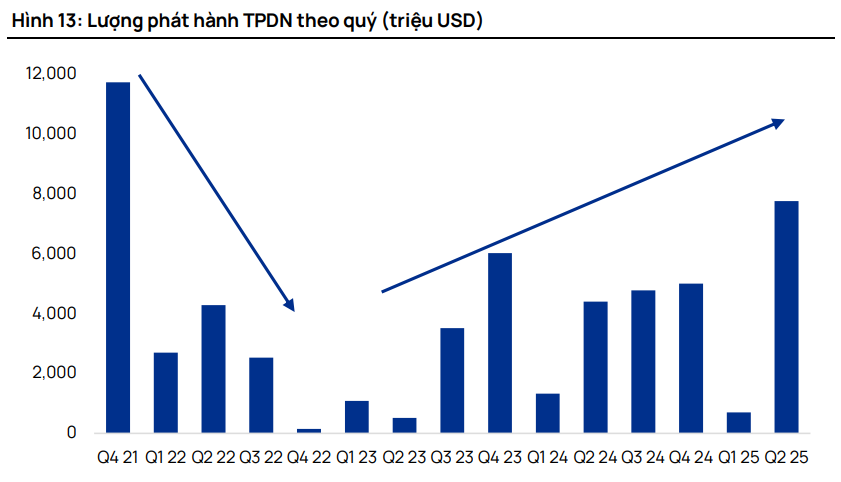 Sau giai đoạn biến động của năm 2022, thị trường TPDN đã đi vào quỹ đạo phục hồi dần kể từ năm 2023, với động lực tăng tốc trong năm 2025. Trong 8T2025, tổng giá trị phát hành mới đã đạt 373 nghìn tỷ đồng (+45% YoY)—một sự phục hồi mạnh mẽ được thúc đẩy bởi cả nhu cầu huy động vốn mới của doanh nghiệp và nhu cầu tìm kiếm lợi suất cao hơn của nhà đầu tư gia tăng.