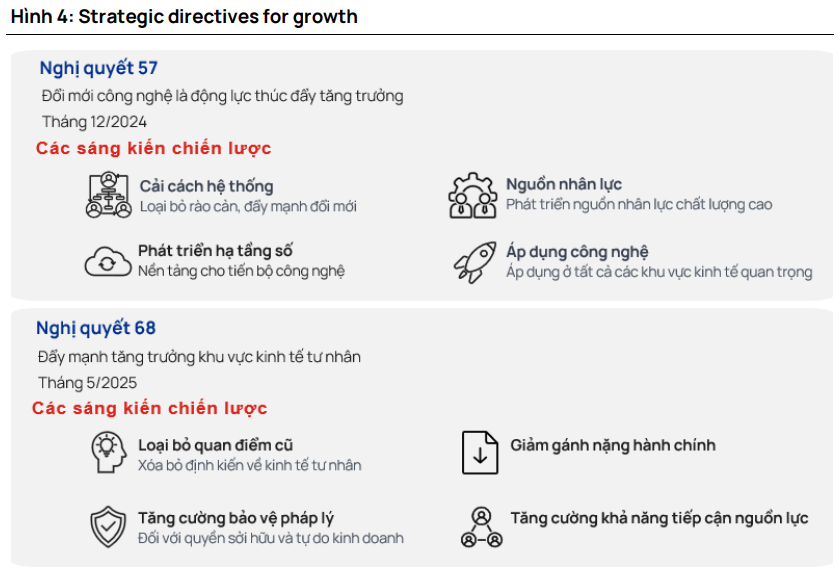 Nghị quyết tập trung vào các đột phá trong phát triển khoa học, công nghệ, đổi mới sáng tạo và chuyển đổi số quốc gia. Trong khi đó, Nghị quyết tập trung vào việc tạo điều kiện cho khu vực tư nhân phát triển, đánh dấu một sự thay đổi chính sách lớn khi chính thức công nhận khu vực tư nhân là một động lực tăng trưởng quan trọng của nền kinh tế. Theo Nghị quyết này, Việt Nam đặt mục tiêu có triệu doanh nghiệp, doanh nghiệp lớn tham gia chuỗi giá trị toàn cầu và khu vực tư nhân đóng góp – GDP vào năm .