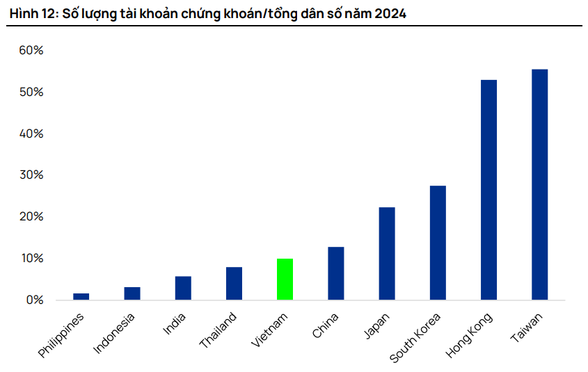 Tỷ lệ tài khoản giao dịch chứng khoán tại Việt Nam vẫn ở mức thấp. Tính đến năm 2024, tài khoản chứng khoán của Việt Nam chỉ chiếm khoảng 9% tổng dân số, cao hơn một số thị trường mới nổi như Thái Lan, Ấn Độ và Indonesia, nhưng vẫn còn kém xa so với các thị trường phát triển hơn ở châu Á. Khoảng cách đáng kể này làm nổi bật tiềm năng tăng trưởng dài hạn của cơ sở nhà đầu tư cá nhân tại Việt Nam, đặc biệt khi trình độ hiểu biết tài chính được cải thiện, các nền tảng giao dịch kỹ thuật số mở rộng và các cải cách thị trường khuyến khích sự tham gia rộng rãi hơn. Bên cạnh đó, với thu nhập hộ gia đình được dự phóng sẽ tăng trưởng với CAGR 10% trong giai đoạn 2025–2030, tài sản trên mỗi tài khoản chứng khoán dự kiến sẽ tăng song song với nhu cầu đầu tư ngày càng lớn. Xu hướng này không chỉ giúp tăng tính thanh khoản của thị trường mà còn hỗ trợ sự mở rộng bền vững của TTCK Việt Nam.