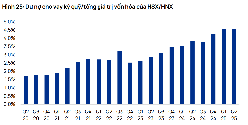 Đầu tiên, đối với mảng cho vay ký quỹ, chúng tôi nhận thấy nhu cầu cho vay ký quỹ đã tăng mạnh nhờ hoạt động thị trường sôi động. Tính đến quý 2/2025, tổng dư nợ cho vay ký quỹ toàn ngành đạt 297 nghìn tỷ đồng (+23,0% so với đầu năm và +40,0% YoY) và tương đương 4,6% tổng vốn hóa thị trường của 2 sàn HSX và HNX (chỉ các chứng khoán trên hai sàn này đủ điều kiện để cho vay ký quỹ). Tỷ lệ này đã tăng đều đặn qua các chu kỳ thị trường từ mức chỉ 1,7% cách đây 5 năm vào quý 2/2020, cho thấy nhu cầu cho vay ký quỹ từ các bên tham gia thị trường không chỉ phụ thuộc vào diễn biến của chỉ số mà còn mang tính cơ cấu hơn.