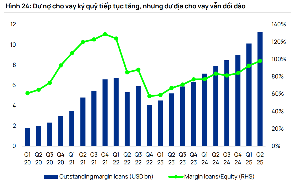 Ngược lại, 5 CTCK độc lập lớn, bao gồm SSI, HCM, VCI, VND và VPS, đã báo cáo tổng dư nợ cho vay ký quỹ là 3,2 tỷ USD vào cuối quý 2/2025, tăng với CAGR 41% so với mức 1,5 tỷ USD vào năm 2022. Tổng thị phần của nhóm CTCK này đã giảm từ 33% vào năm 2022 xuống 30% vào cuối quý 2/2025. Chúng tôi cho rằng hiệu suất vượt trội của các CTCK được hậu thuẫn bởi ngân hàng trong mảng cho vay ký quỹ là nhờ lợi thế về bảng cân đối kế toán quy mô lớn và nguồn vốn, và chúng tôi kỳ vọng xu hướng này sẽ tiếp tục trong tương lai gần.