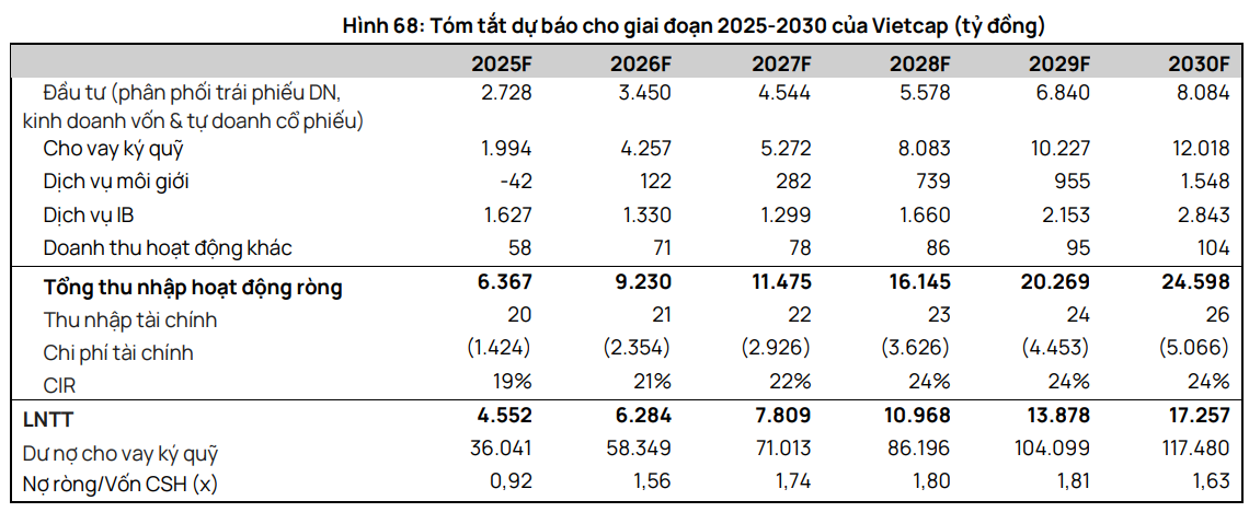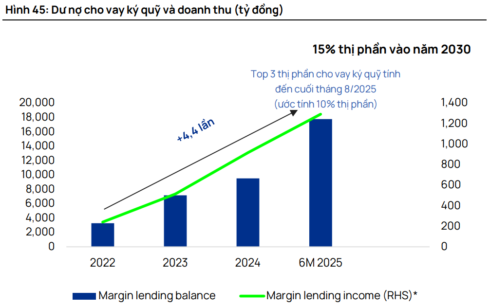 Cho vay ký quỹ sẽ tiếp tục là động lực tăng trưởng chính trong mảng môi giới, đóng góp ổn định khoảng 40%-42% tổng doanh thu trong giai đoạn 2026-2030. Đà tăng trưởng này sẽ được hỗ trợ bởi lợi thế chi phí vốn của VPBankS nhờ sự hậu thuẫn mạnh từ ngân hàng mẹ và SMBC, cùng với tiềm năng mở rộng tệp khách hàng.