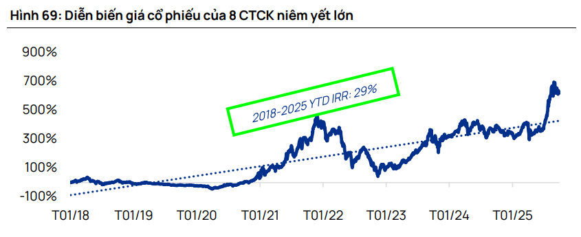 Được hậu thuẫn bởi tăng trưởng lợi nhuận mạnh, cổ phiếu các CTCK đã mang lại mức lợi suất kép ấn tượng cho nhà đầu tư trong dài hạn. Một danh mục giả định phân bổ đều gồm 8 CTCK niêm yết lớn nhất theo vốn hóa thị trường (SSI, VIX, VND, VCI, SHS, MBS, HCM và FTS), nếu được đầu tư từ đầu năm 2018, thì đến ngày 29/09/2025 đã tăng hơn 7 lần, tương ứng với IRR xấp xỉ đạt 29%.