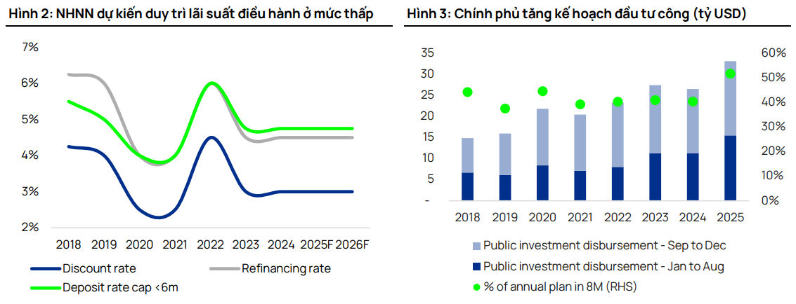 Về chính sách tiền tệ, NHNN được kỳ vọng sẽ duy trì lãi suất điều hành ở mức thấp để hỗ trợ tăng trưởng kinh tế. Áp lực tỷ giá USD/VND hiện tại là một thách thức đối với quan điểm nới lỏng của NHNN, nhưng chúng tôi tin rằng việc FED tiếp tục cắt giảm lãi suất sẽ tiếp tục giảm bớt áp lực tỷ giá cuối năm và cho phép NHNN giữ vững định hướng này.