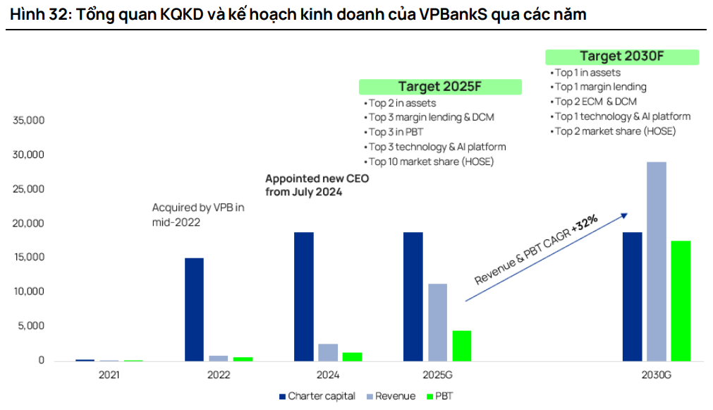 Được hậu thuẫn bởi ngân hàng và tập trung vào việc thực thi, VPBankS có vị thế tốt để mở rộng quy mô. Được hỗ trợ bởi sức mạnh vốn của VPB, quan hệ đối tác chiến lược với SMBC, hệ sinh thái khách hàng và cơ sở hạ tầng dùng chung, công ty đang tăng tốc tăng trưởng trên các phân khúc cốt lõi. Với mục tiêu LNTT năm 2030 đạt tỷ đồng (ROE ) và mục tiêu thị phần hai con số trên các mảng môi giới, phái sinh, cho vay ký quỹ và thị trường vốn nợ (DCM), VPBankS đang thực thi một chiến lược tăng trưởng toàn diện—tận dụng AI, blockchain, tích hợp WealthTech và các quan hệ đối tác toàn cầu để mở rộng mức độ phủ sóng của công ty trong thị trường vốn, quản lý tài sản và đầu tư tự doanh.