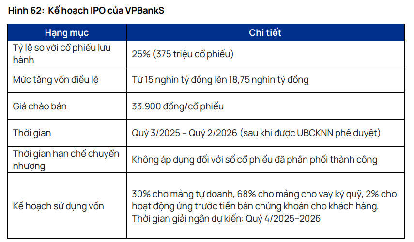 - VPBankS đặt mục tiêu tiến hành IPO vào quý 3/2025-quý 2/2026, chào bán 25% cổ phiếu đang lưu hành (375 triệu cổ phiếu) với giá chào bán là 33.900 đồng/cổ phiếu.