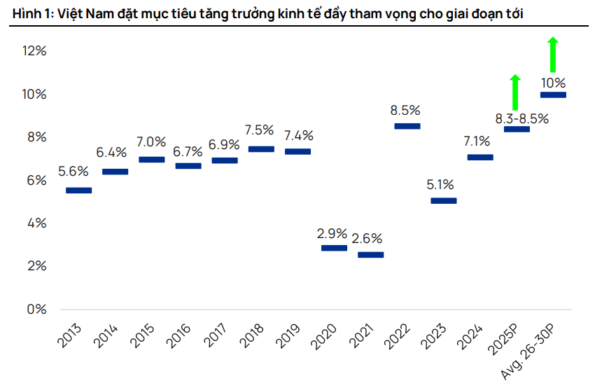 Trong 6T 2025, tăng trưởng GDP của Việt Nam đạt YoY, mức cao nhất trong 6 tháng đầu năm kể từ năm . Vào ngày , Chính phủ đã ban hành Nghị quyết , đặt ra các mục tiêu tăng trưởng, nhiệm vụ và giải pháp trọng tâm để đảm bảo tăng trưởng GDP năm sẽ đạt –. Điều này sẽ tạo động lực và một nền tảng vững chắc để Việt Nam đạt được mức tăng trưởng 2 chữ số trong giai đoạn –.