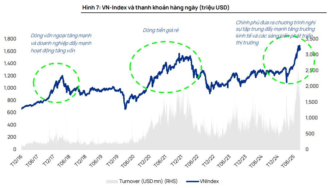 VN-Index đã bước vào một chu kỳ tăng giá dài hạn mới trong năm 2025. Khi so sánh năm 2025 với các chu kỳ tăng giá trước đây như giai đoạn – và –, có thể thấy rõ ràng giai đoạn hiện tại mang những đặc điểm riêng biệt, cho thấy thị trường đang bước vào một kỷ nguyên tăng trưởng mạnh mẽ mới. Những đặc điểm này bao gồm: các điều kiện tiền tệ nới lỏng kết hợp với chính sách tài khóa mở rộng, tương tự như môi trường kích thích kinh tế của giai đoạn –; triển vọng về dòng vốn nước ngoài đáng kể được hỗ trợ bởi việc Việt Nam được dự kiến nâng hạng lên thị trường mới nổi theo phân loại của FTSE cùng như một loạt các đợt IPO tiềm năng, gợi nhớ đến hoạt động huy động vốn sôi động và sự mở rộng của thị trường trong giai đoạn –.