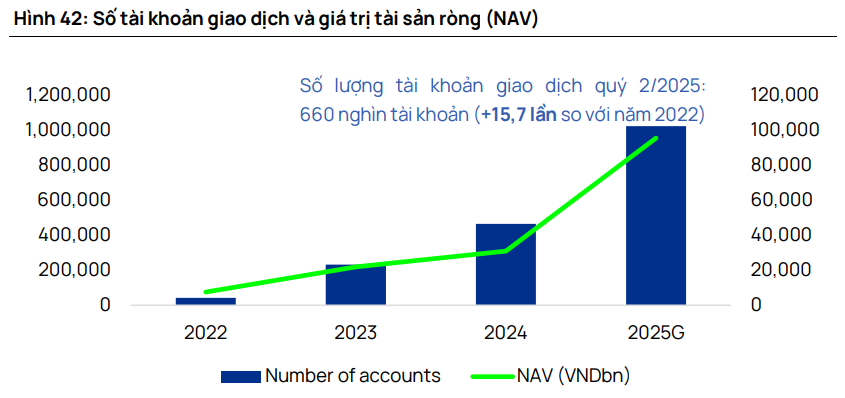 VPBankS ghi nhận mức tăng trưởng đáng kể về cơ sở khách hàng môi giới, đạt 660.000 tài khoản vào quý 2/2025—tăng gấp 15,7 lần so với năm 2022. Xu hướng tăng trưởng theo cấp số nhân này được kỳ vọng sẽ tiếp tục, với dự phóng số lượng tài khoản giao dịch sẽ vượt 1,8 triệu vào năm 2027. Giá trị tài sản ròng (NAV) và giá trị giao dịch của nhà đầu tư cũng tăng đáng kể, phản ánh niềm tin và sự gắn kết ngày càng tăng của nhà đầu tư đối với công ty.